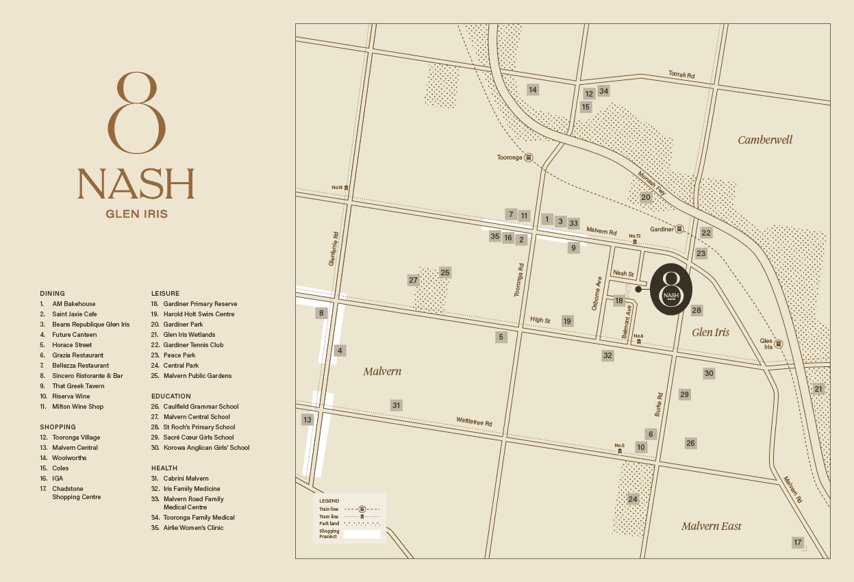 In a discreet, tranquil pocket of the most desirable area of Glen Iris, you will discover Nash Street, graced by century‑old gum trees and the Gardiner Primary Reserve. Situated directly beside the park, 8 Nash transforms this rare 1,250 m2 parcel of land into a highly limited collection of architect‑designed, carefully curated two and three bedroom residences, including three crowning penthouses. Each residence is carefully conceived as a private sanctuary of light, outlook and refined materiality, offering spacious and luxury living in one of Melbourne’s most sought‑after suburbs.